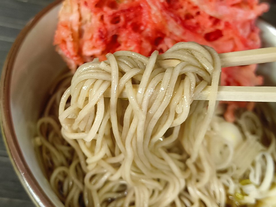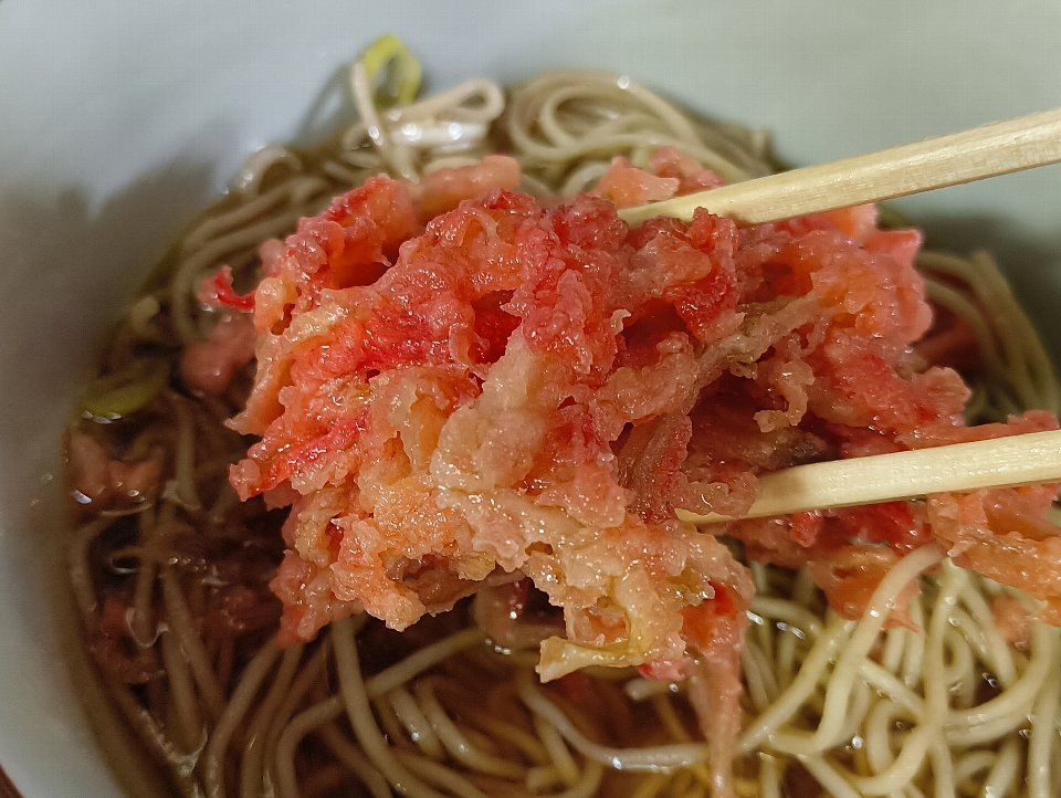 こうして「紅しょうが天」をいじっていると、ほんのりと油が出て、蕎麦全体をコーティングしてくれる。