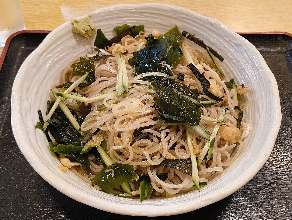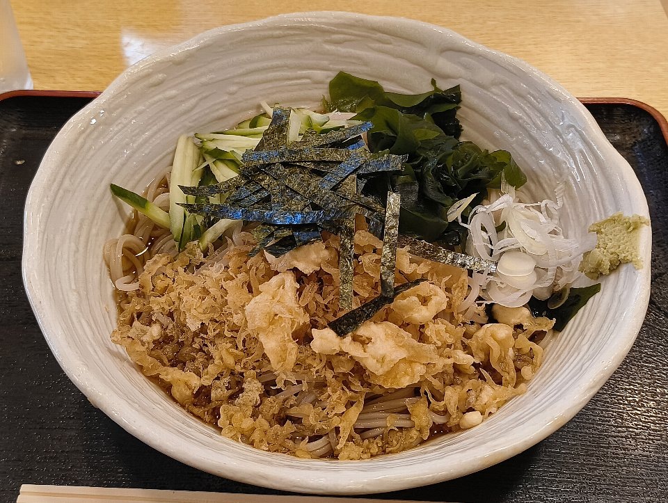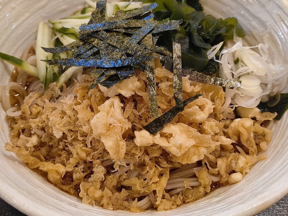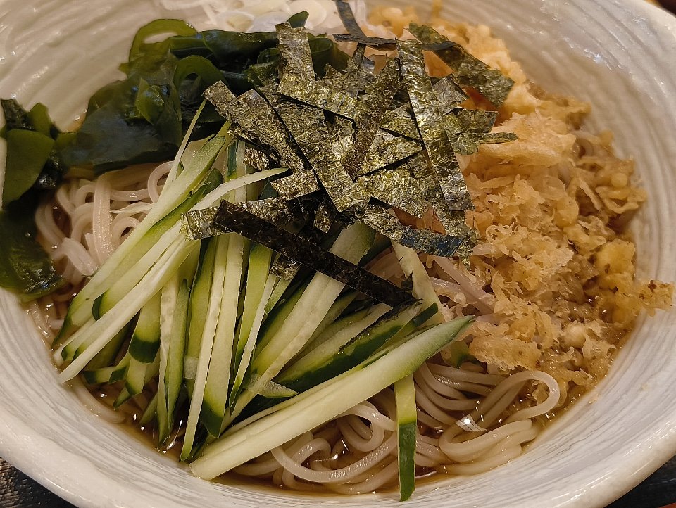 出てきた「冷したぬきそば」は、「天かす」に「胡瓜」と「わかめ」、そしてその上の「刻み海苔」がのっている何時もの様相だ。