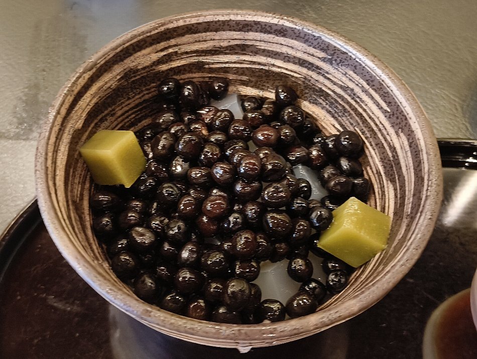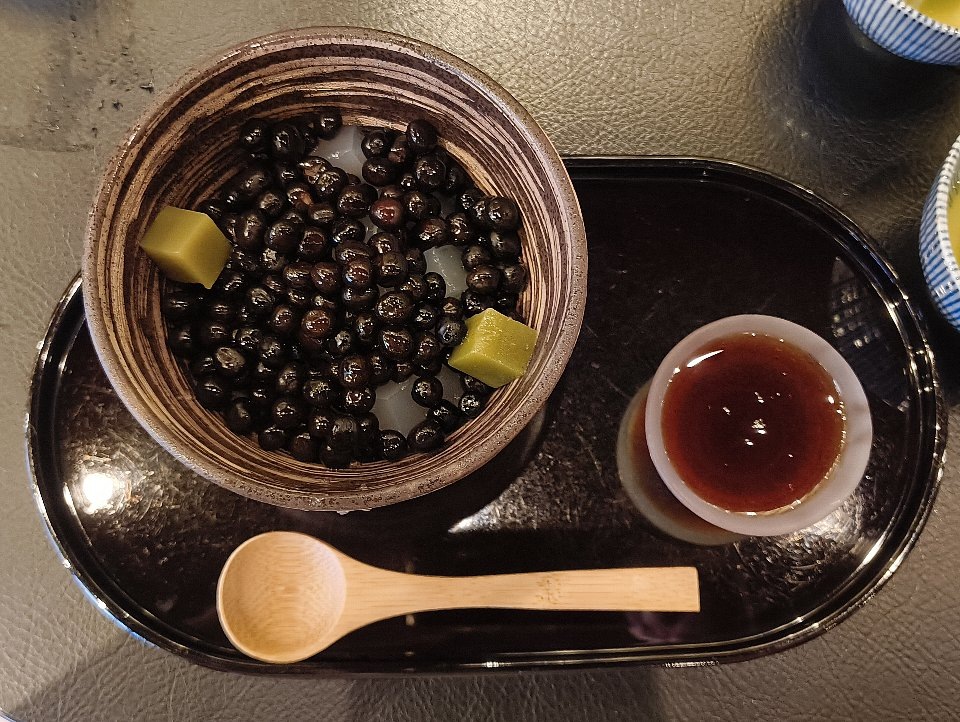 そして「赤えんどう豆」をしげしげと眺め、そして「赤えんどう豆」を「黒蜜」につけて食べる。