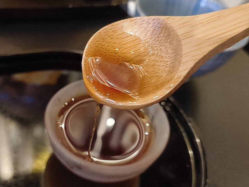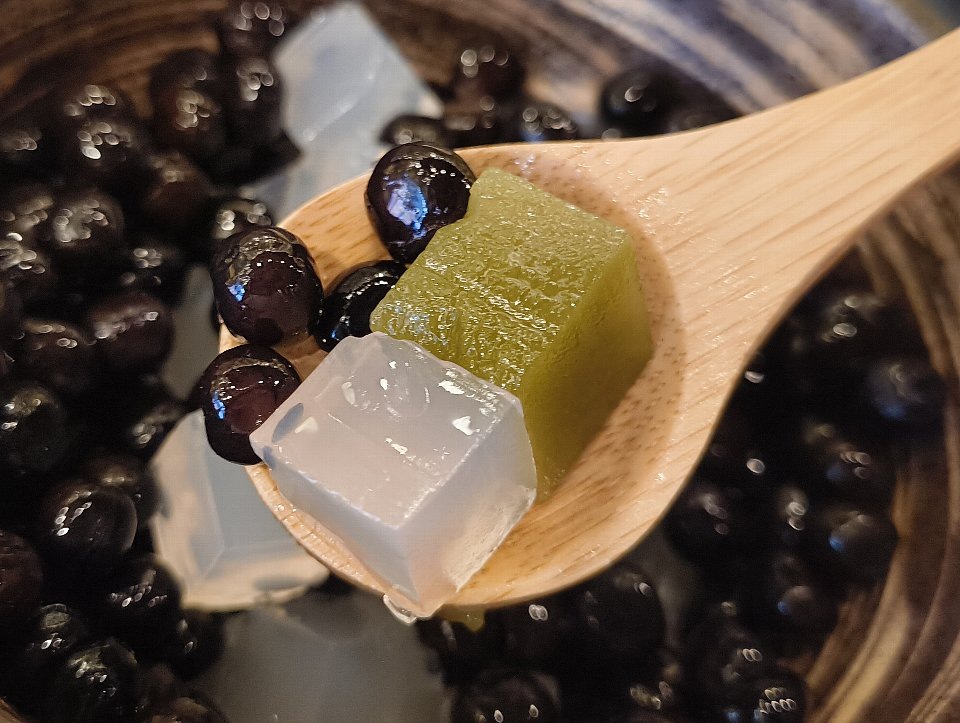 さらには木さじに少しだけ「寒天」と「赤えんどう豆」をのせ「黒蜜」につけて食べてみる。