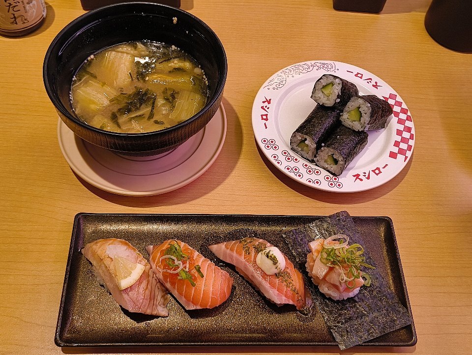 今回は「サーモン」が4種類しかないので、「きゅうり巻」と「茄子の味噌汁」も頼んでみた。