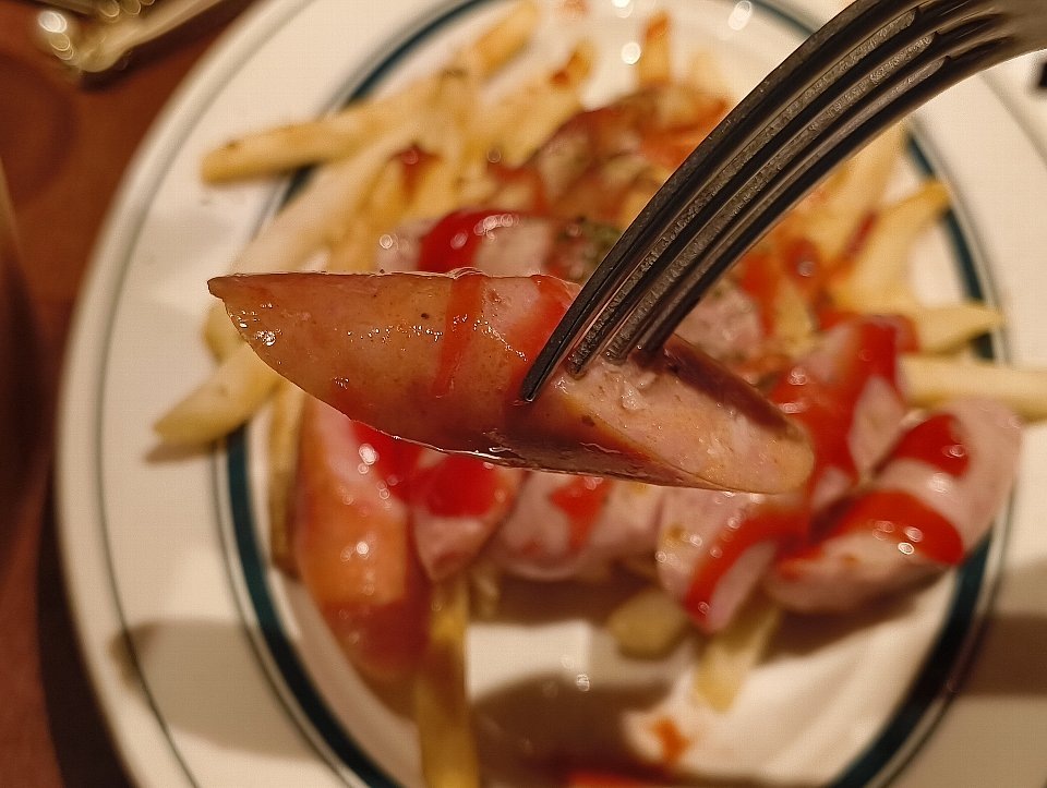 そして「ドイツのB級グルメ カリーヴルスト」がやってきて、狭いテーブルの上はもっと狭くなる。