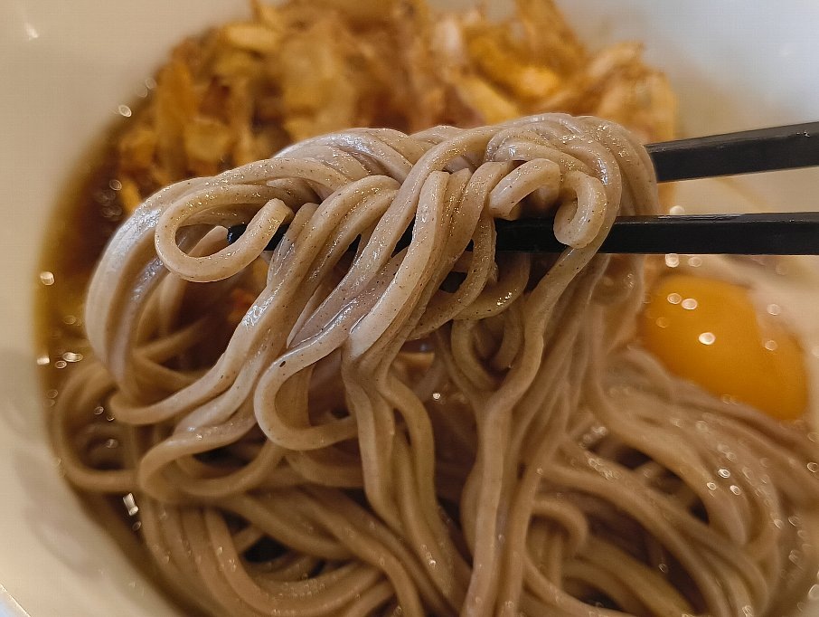 高いなーと思うが、「蕎麦」一見するとちょっと揚げすぎた「かき揚げ」に白身を曇らせた「たまご」である。