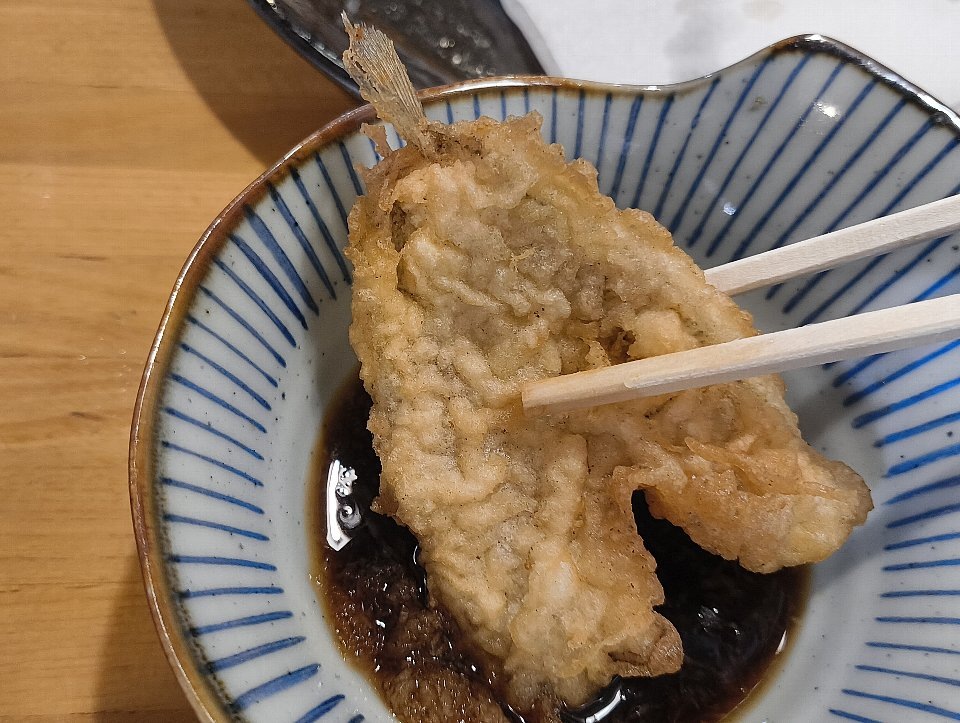 まるほど懐かし姿をした「天ぷら」だ。衣の付け方が昔の「蕎麦屋」を思わせる。