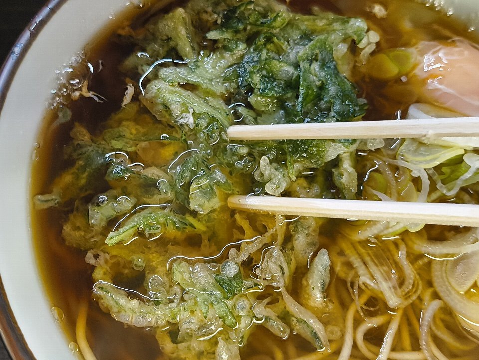 この日のランチは「文殊 浅草店」で「春菊天そば」+「生たまご」を手繰った。