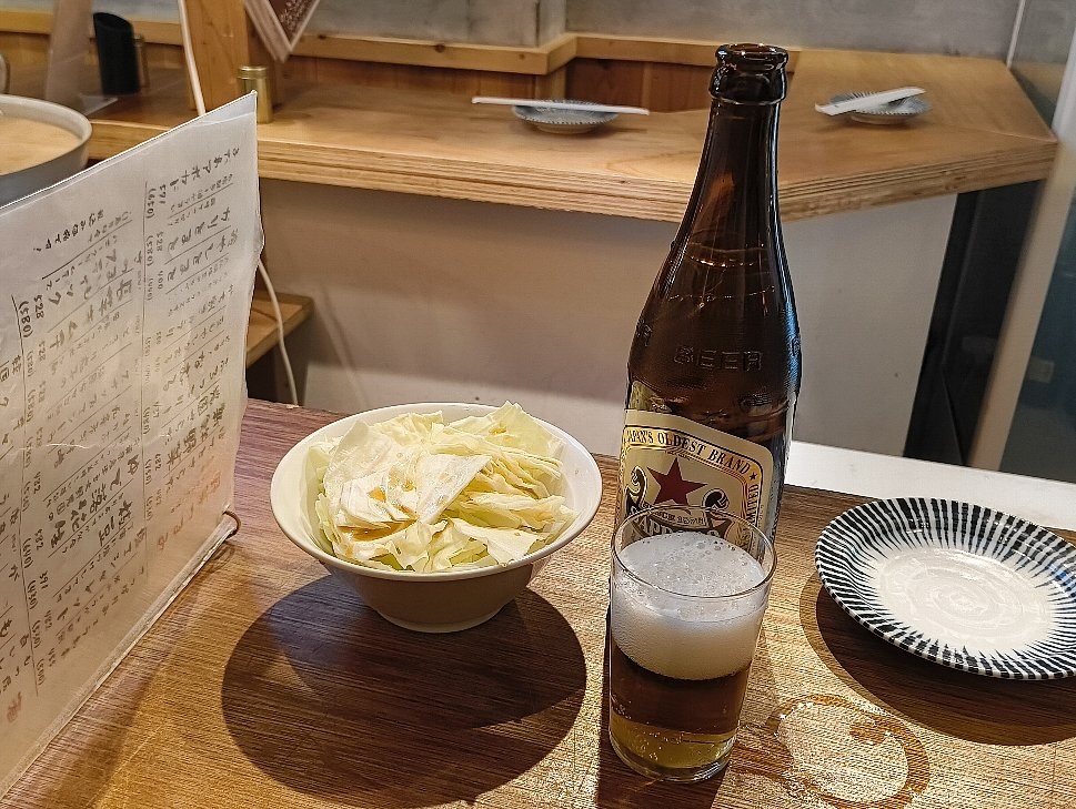 「紅星」と「お通し」が出てきたので乾杯をしていると「もつ煮」がやってくる。