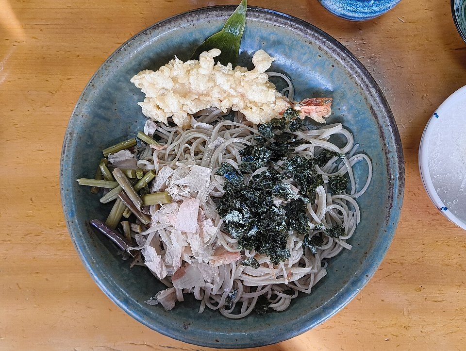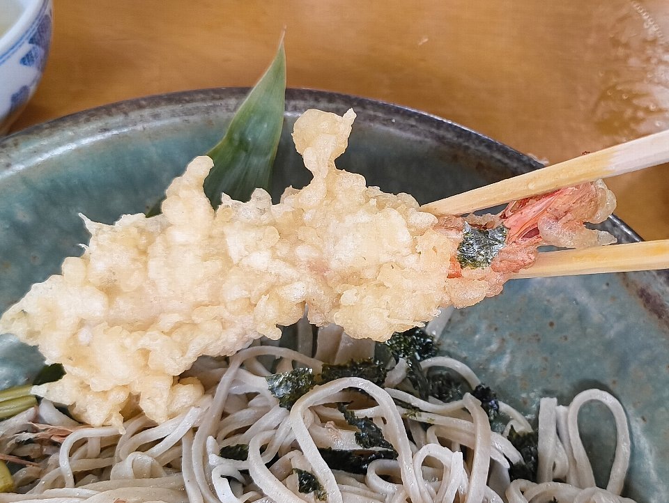 その姿は相変わらずの朴訥としたもので、「蕎麦」の上には「花がつお」と「山菜」と「海苔」があり、そして「海老天」が控えている。