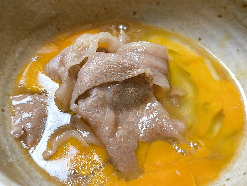 一煮立ちする。そしたら「肉」を「玉子」をといだ器に入れる。