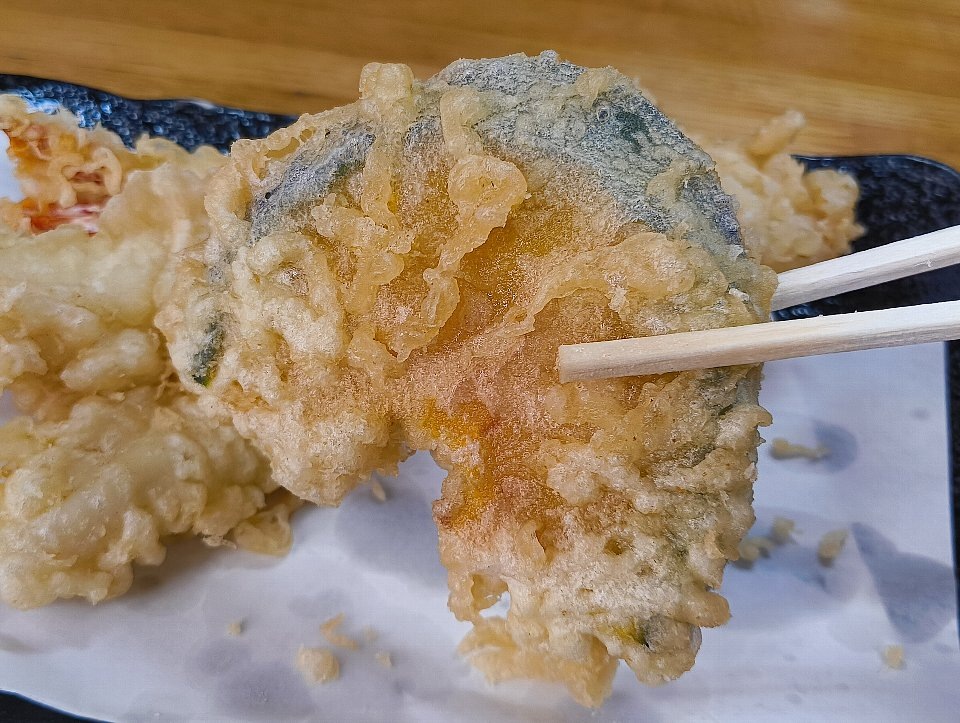そして「天ちら」の登場だ。「茄子」と「おくら」と「かぼちゃ」を食べた処で「もりそば」をもらう。