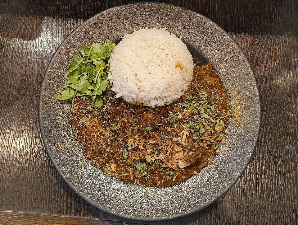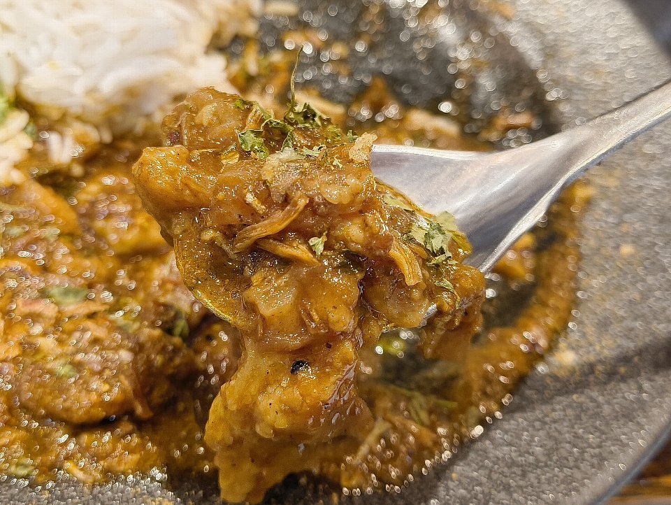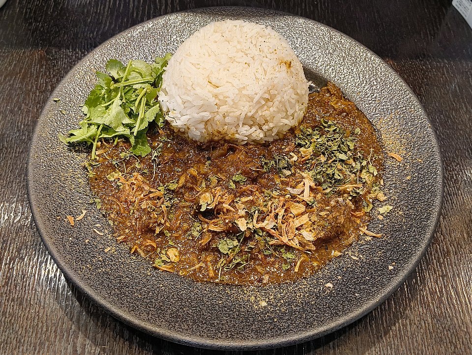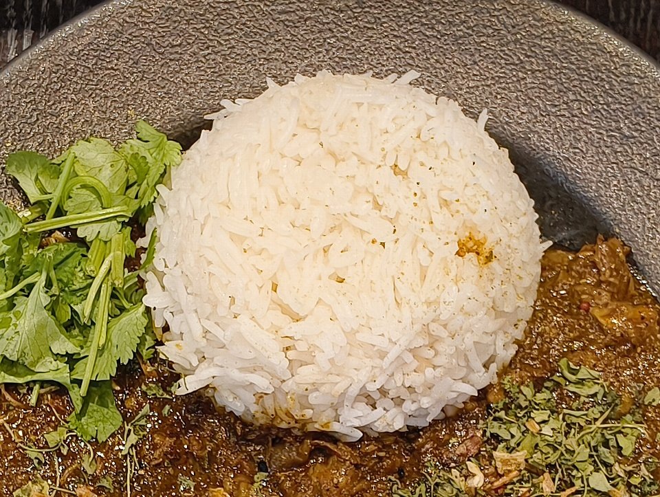 「バスマティライス」がこんもりと盛られ、「牛すじ」を秘めた「カレー」に「パクチー」が少しある。