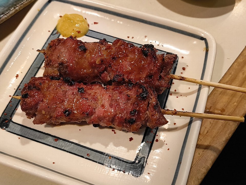 暫く「お通し」と「大瓶」で吞んでいたのだが、先に頼んでいた「串焼き」が出てきはじめる。