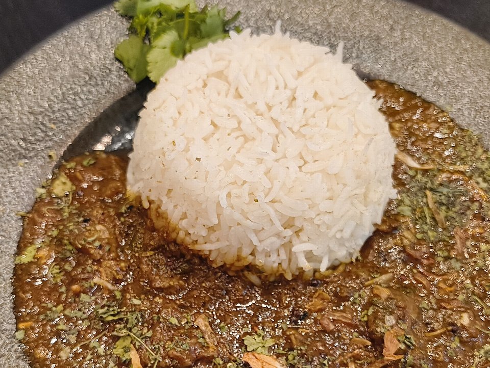 こんもりと盛られたバスマティライスに牛すじを秘めたカレー。