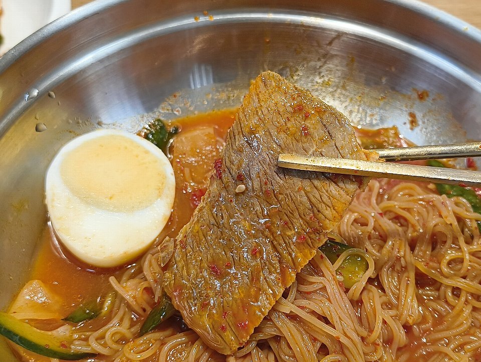 盛岡冷麺なら、最初に茹で玉子の黄身を潰してスープに溶かし込むのが私の流儀だが、ビビン冷麺ではそうもいかない。