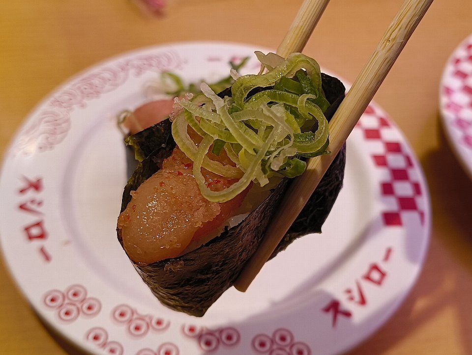 最初に届いたのは、「軍艦」と「3貫盛り」だ。まずは「やまやの明太子軍艦」をひとつ。たらこを素材にしながらも、唐辛子との相性はやはり抜群だ。