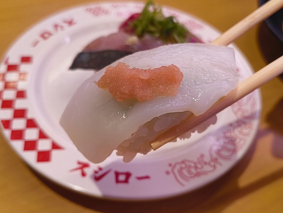 「馬刺しにぎり」「天然さば」「そでいか」の3種なのだが、なんと「そでいか」の上に明太子がのっているではないか。