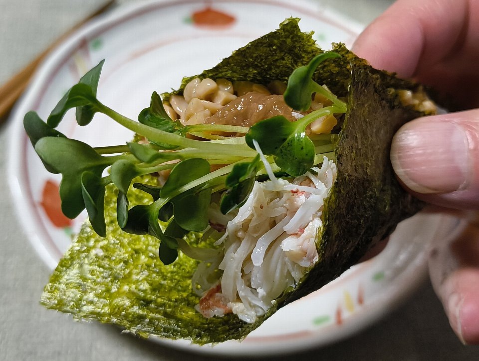 そして、蟹の身と味噌の「ハイブリッド」をたっぷりと贅沢に乗せる。さらに「貝割れ大根」を添えるのが我が家の基本。