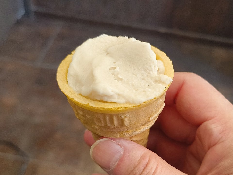 家人の「ナチュラルアイス」が、コーンの部分だけ残された状態でこちらへ回ってくる。