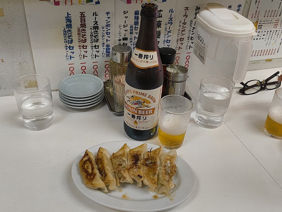 あたしらが荷物をテーブルの下に置いている間に、「ビール」と「餃子」があっというまに出て来る。