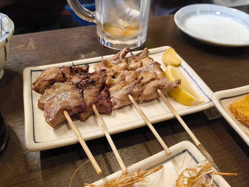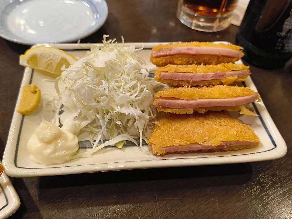 サクッとした衣に懐かしさが詰まった、厚切りの「ハムカツ」。「海老の唐揚」も「鶏皮ポン酢」も「もつ焼き」も相変わらず元気に登場する。